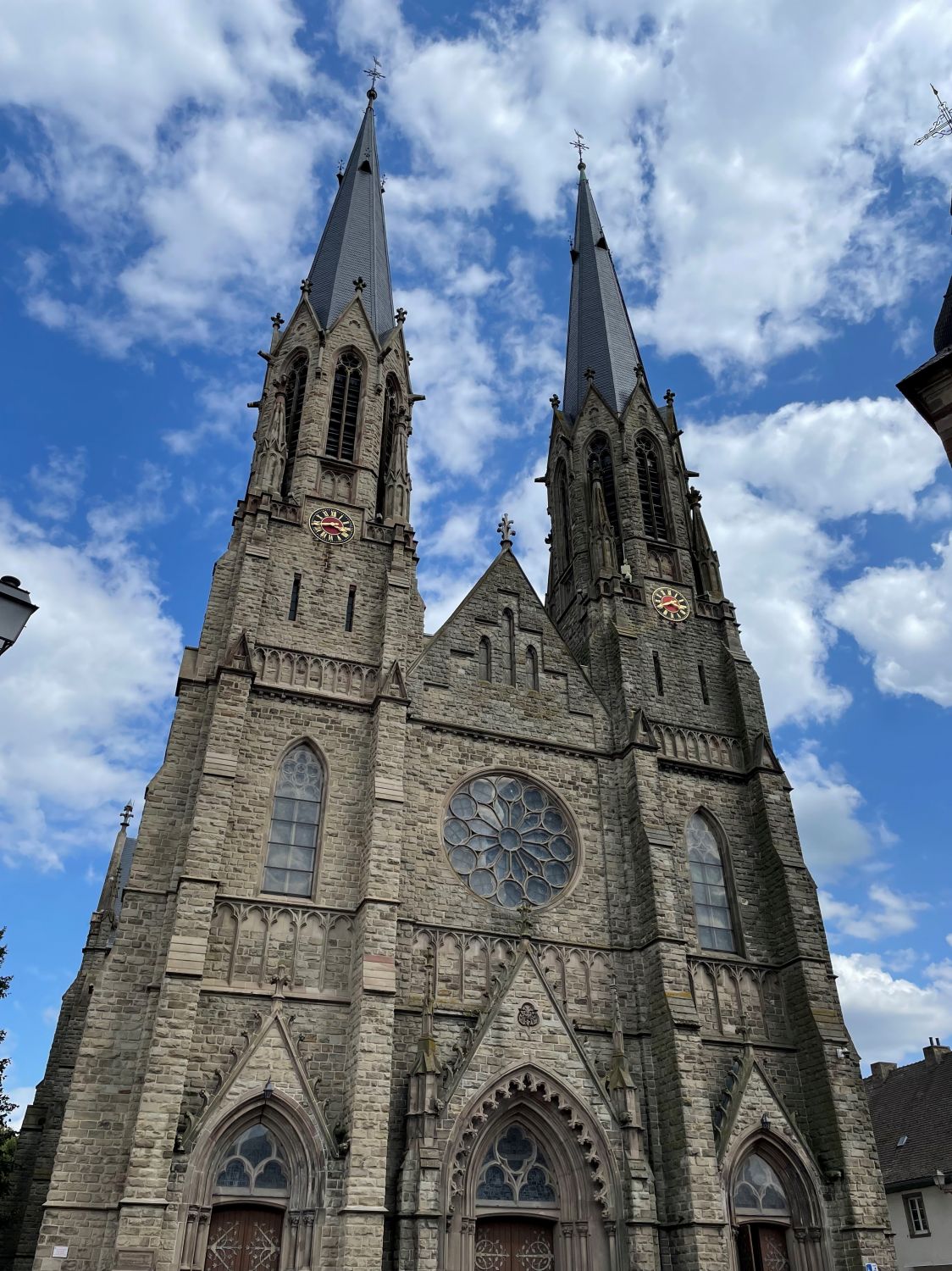 Je crois que le lieu emblématique de Sarralbe, c'est sa tour du XIIe siècle, mais plus précisément l'église qui est à côté, que l'on reconnaît par ses flèches lorsqu'on arrive sur Sarralbe. La tour comme dit, est du XIIe siècle ; sa dernière utilisation concrète était en tant que clocher de l'église antérieure à l'église actuelle. Et puis l'église, qui est quand même d'un style néogothique pur et dur, a été mise en chantier en 1904, inaugurée et sacralisée en 1907, et qui est donc une caractéristique d'une période où la Moselle était allemande, et où l'architecte était lui-même allemand.