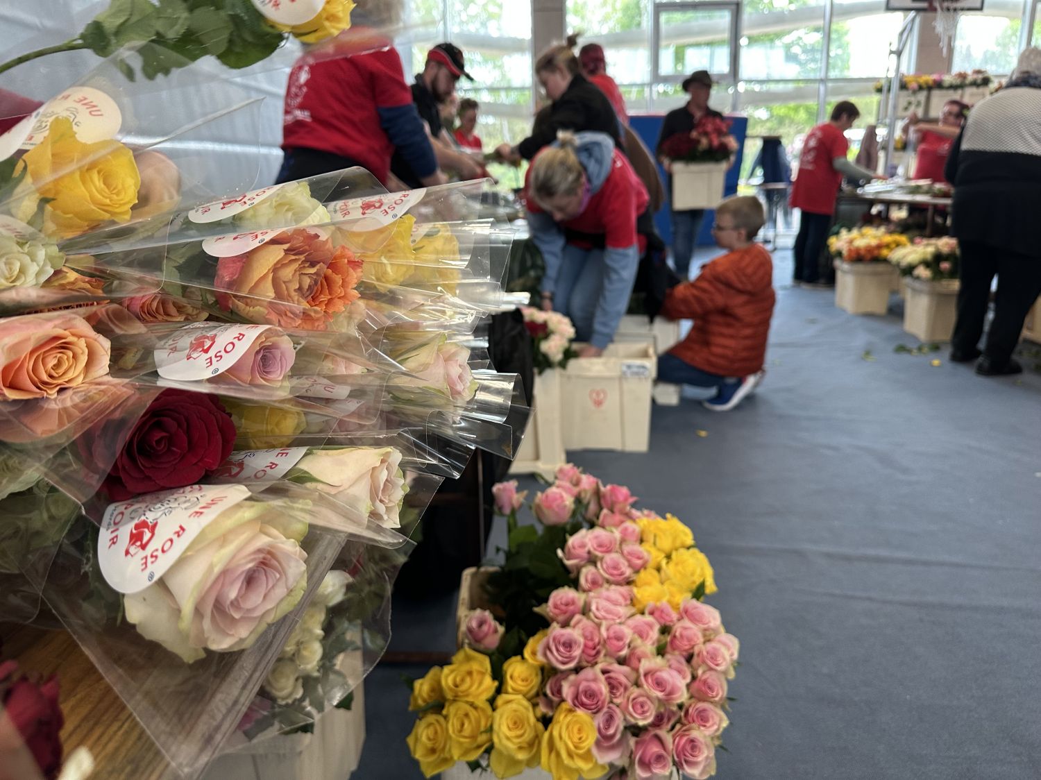 Dans le gymnase, plus d’une centaine de bénévoles, comme Marion, trient et emballent les roses.