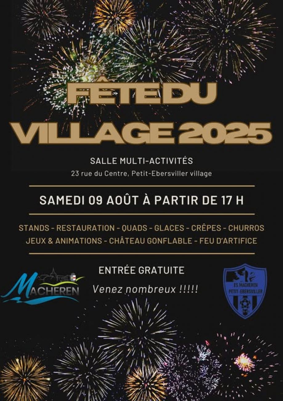 Grande fête du village, ce samedi 09 août à Petit-Ebersviller village à partir de 17 heures. Un grand feu d'artifice sera tiré.