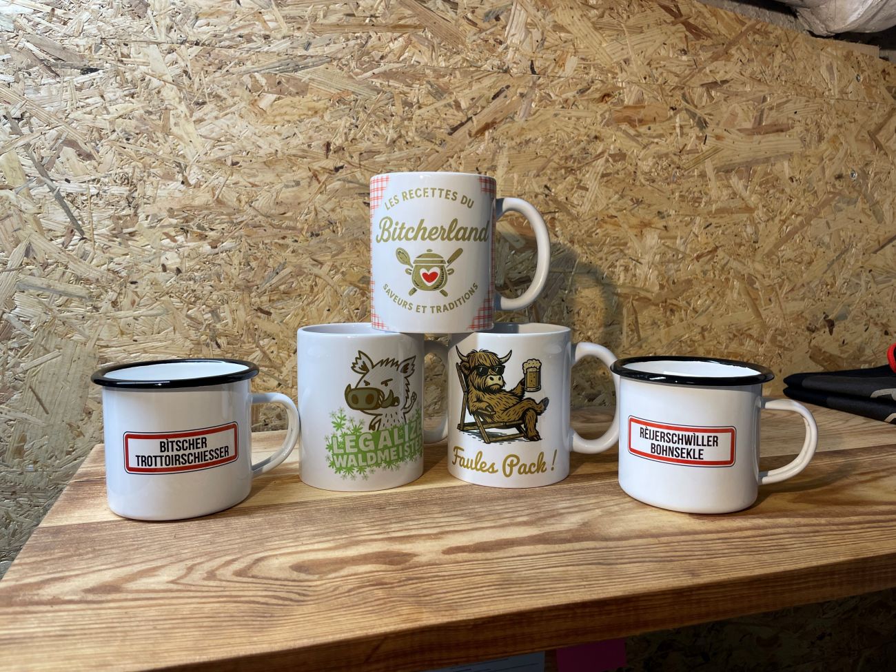 Le gros travail a été de mettre en avant les sobriquets du pays de Bitche, parce qu'on est des amoureux du platt, on voulait mettre ça en avant, donc on a décliné vraiment tous les surnoms des villageois du pays de Bitche sur nos t-shirts.