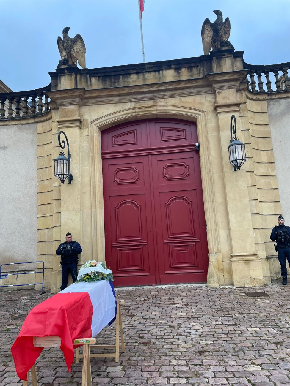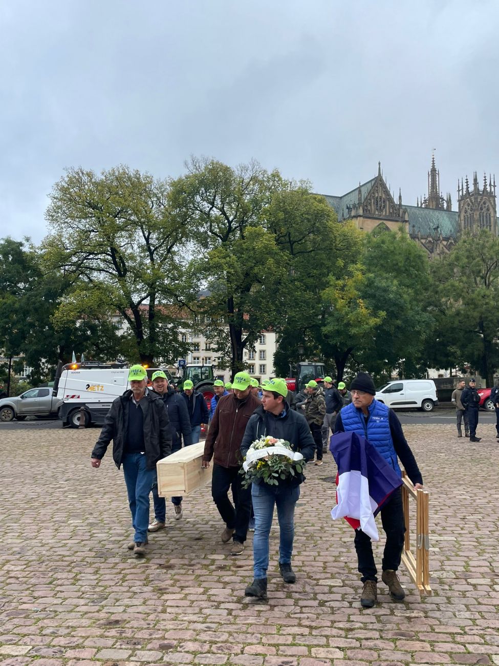 Les agriculteurs déposent un cercueil devant la préfecture de la Moselle pour ''les funérails de l'agriculture''