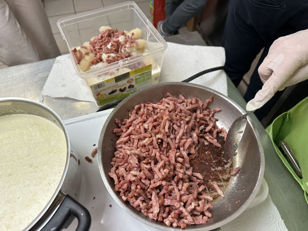 Nous, on est aux lardons, croûtons, crème fraîche. Les jeunes, quand ils vont chercher les Sputz, ils nous demandent de servir les croûtons ou les lardons selon la commande et on met la quantité qu’il faut.