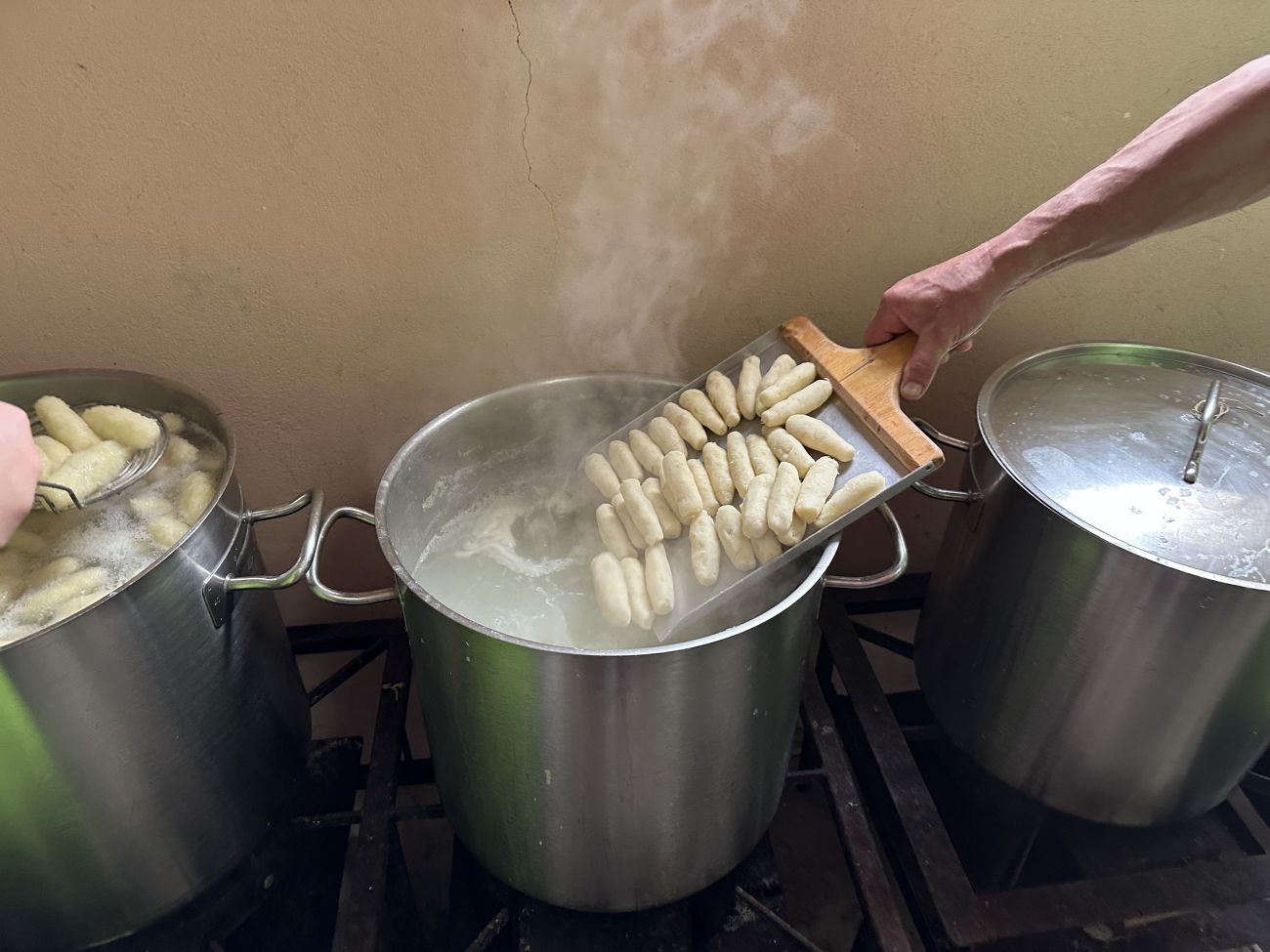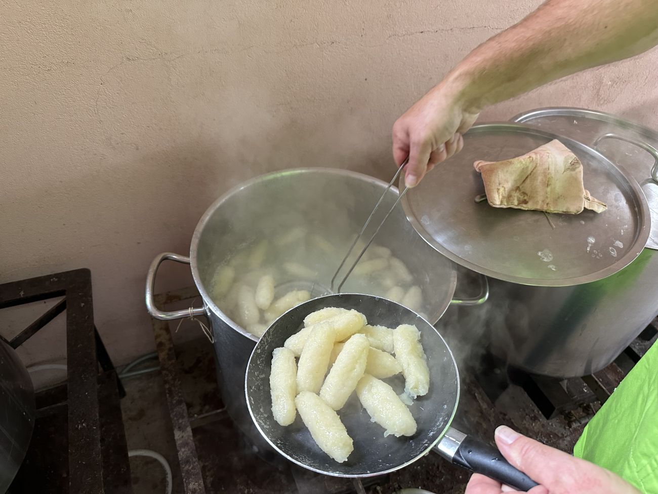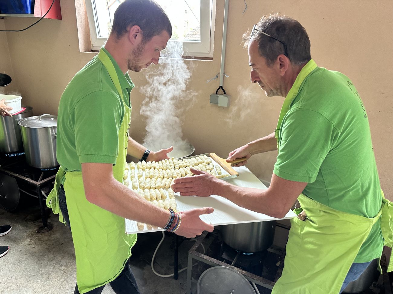 C’est dans plusieurs grandes marmites remplies d’eau bouillante que ces sputznudel sont cuites sous l’œil avisé des bénévoles comme Mathias.