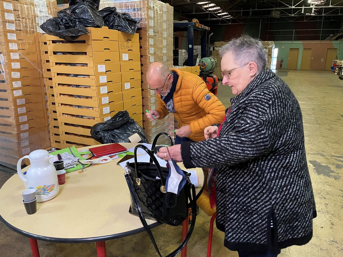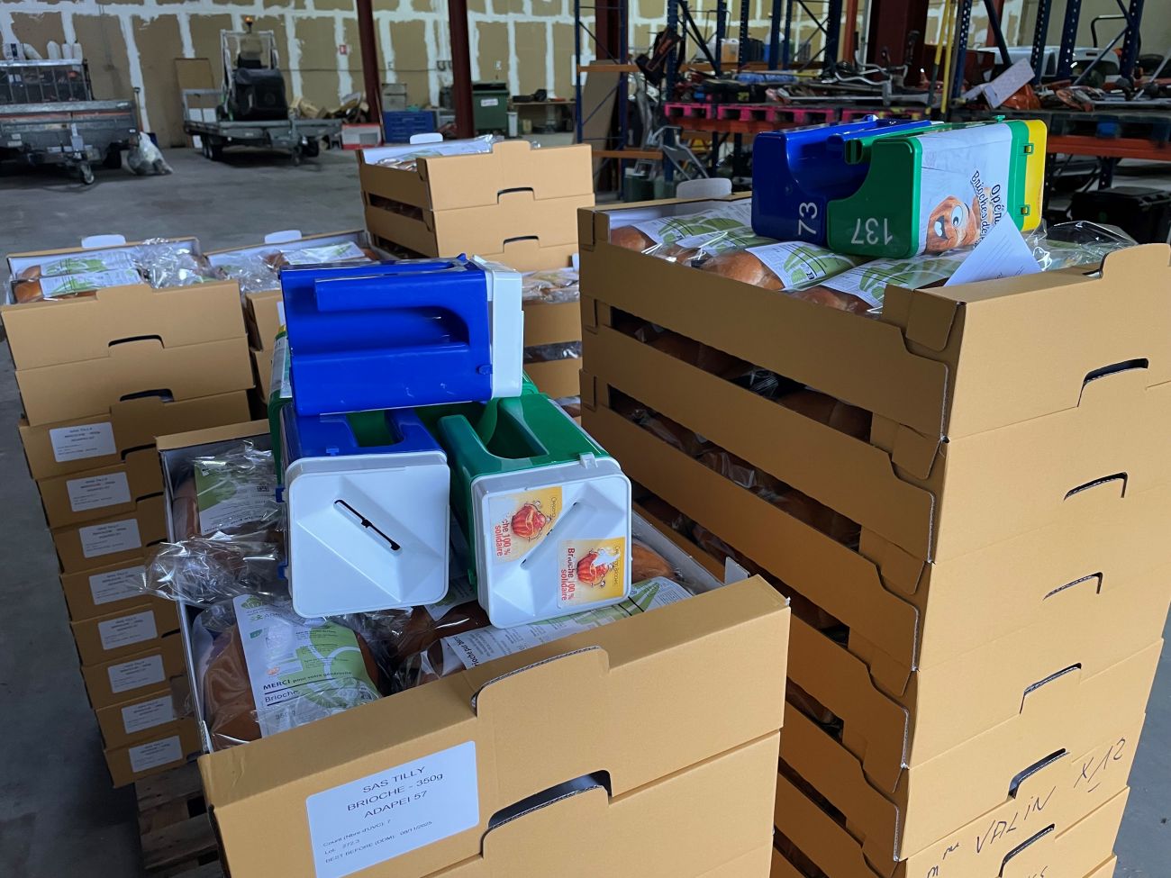 Là, on prépare tout ce qui concerne la ville de Saint-Avold. Ce sont donc les personnes des associations de Saint-Avold qui viennent chercher les brioches qu'elles vont distribuer ensuite dans les différents quartiers. On fait des tas sur des palettes afin que les personnes puissent les prendre et les charger dans leur voiture.