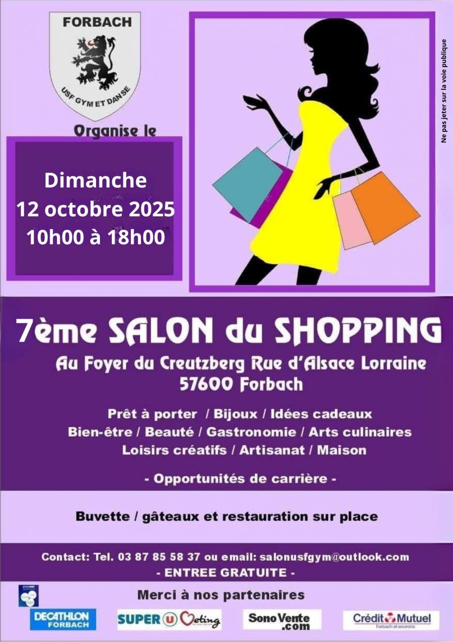 L’USF Gym et Danse organise, ce dimanche, au foyer du Creutzberg de Forbach, de 10h à 18h, le 7e salon du shopping, avec une quarantaine d’exposants de domaines variés qui seront présents. Rendez-vous de 10h à 18h. L’entrée est libre.