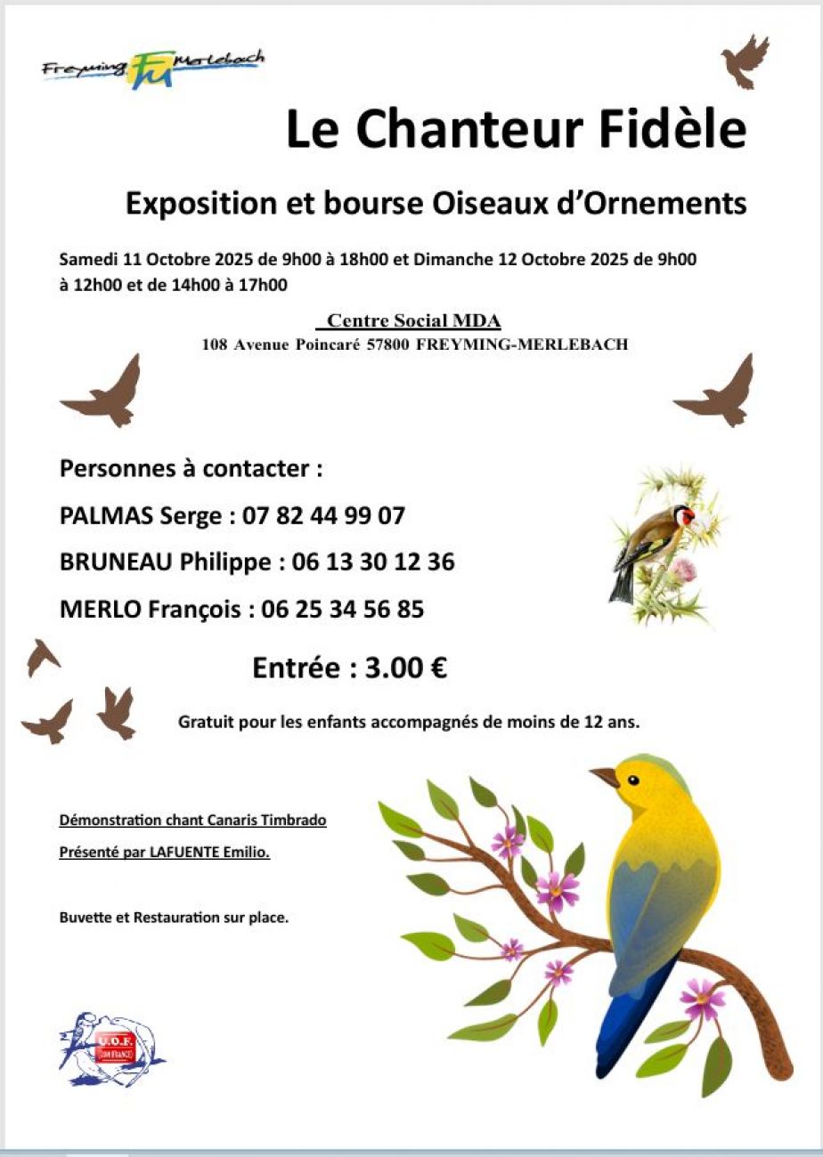 Une bourse aux oiseaux a lieu à la maison des associations de Freyming-Merlebach, ce samedi, de 9h à 18h, et dimanche de 9h à 12h et de 14h à 17h. Entrée : 3€.