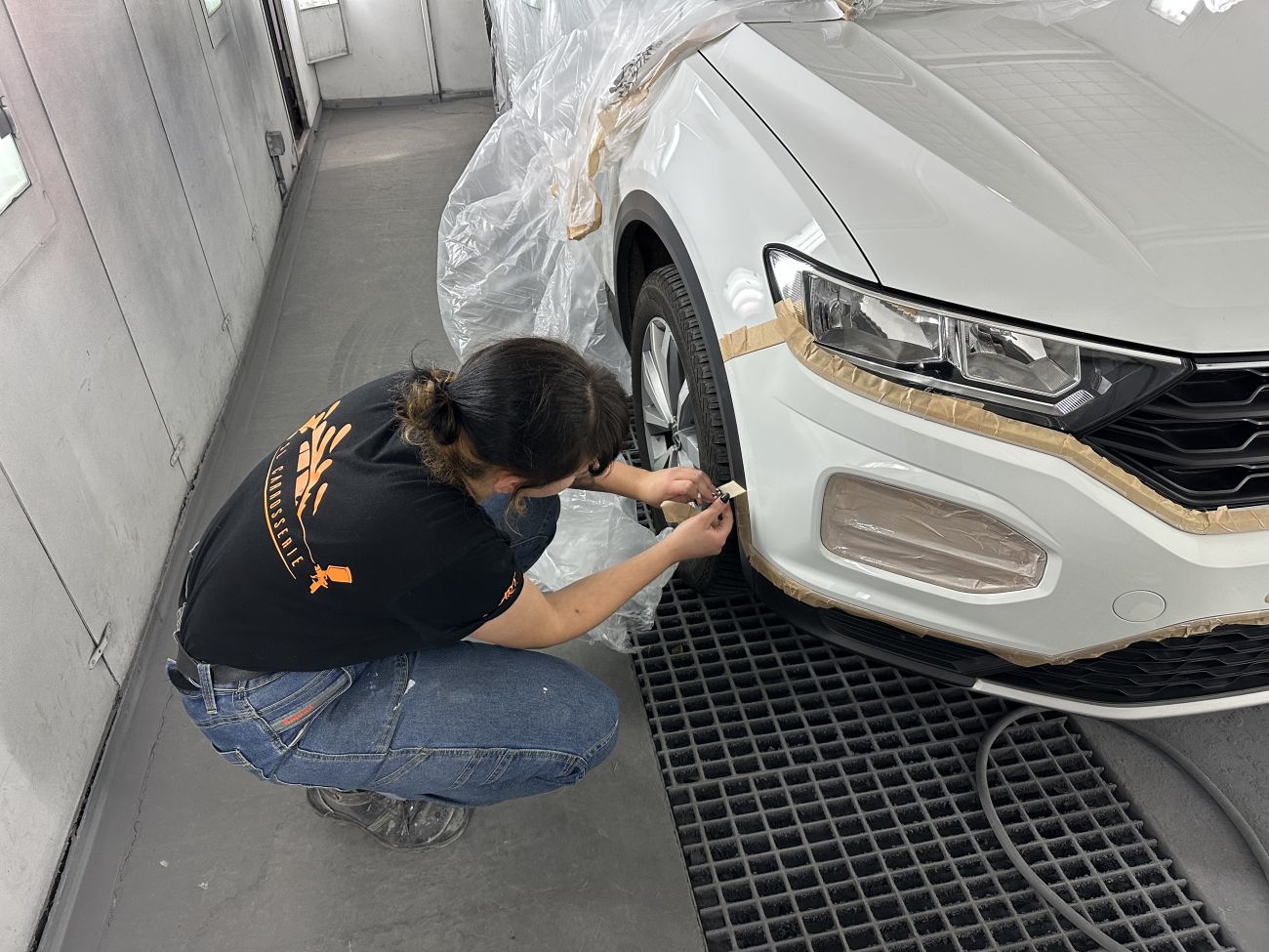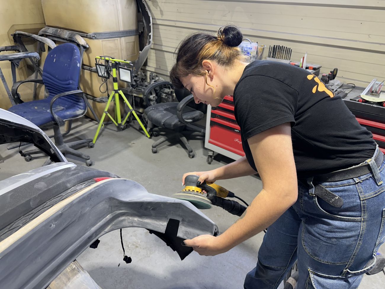 En pleine séance de ponçage de pare-chocs, Cécile, est revenue sur ses missions au sein de l’entreprise SL Carrosserie.