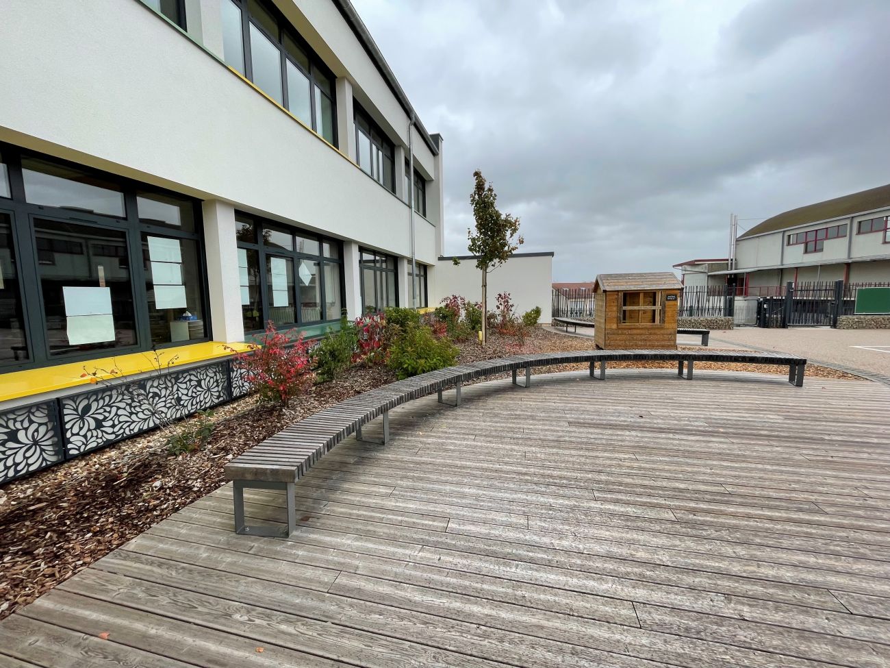 Grâce au CAUE de la Moselle qui a fortement contribué par des ateliers thématiques à travailler avec les enfants sur une "cour idéale", comme ils l'appellent, avec des arbres, avec des espaces de jeu, des espaces pour faire cours dehors, un potager, et maintenant, on se retrouve avec cette cour végétalisée, on voit le circuit de l'eau, on la récupère aussi.