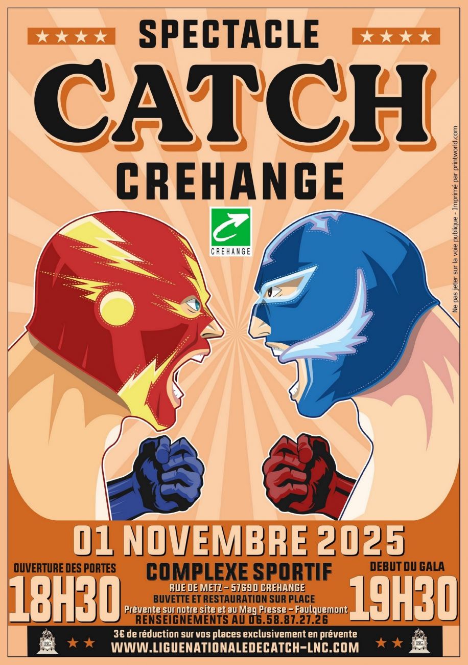 Un gala de catch international a lieu ce samedi soir au complexe sportif de Créhange. Début du show à 19h30. Comptez 12€ l’entrée.