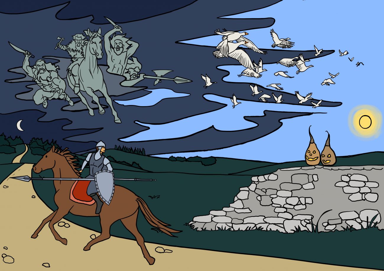 A partir du moment où on passe dans la moitié sombre de l’année, c’est-à-dire qu’il faut oublier un peu l’idée des 4 saisons, c’est deux moitiés qui s’opposent et s’épousent, une moitié sombre de l’année qui cède sa place à une moitié claire de l’année. Et cette lutte de la moitié sombre de l’année est représentée par un chasseur sauvage, qui, à partir des nuits sombres d’automne, des tempêtes de l’automne, fait irruption dans le ciel. C’est un cavalier, sur son cheval blanc, accompagné par des chiens blancs et une horde furieuse de guerriers morts au combat.