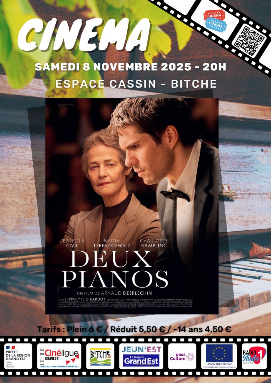 Une séance de cinéma à l'espace Cassin de Bitche, c’est à 20h avec la diffusion du film « Deux pianos ». L’entrée est à 6 euros.