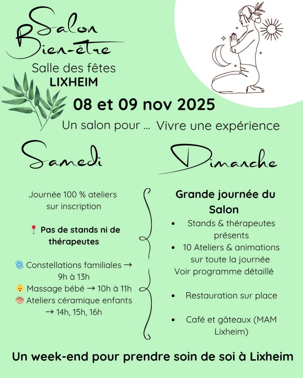 2ème édition du salon bien-être à la salle des fêtes de Lixheim tout le week-end avec différents exposants et ateliers. Accupression, lithothérapeute ou encore soin énérgétique au programme.