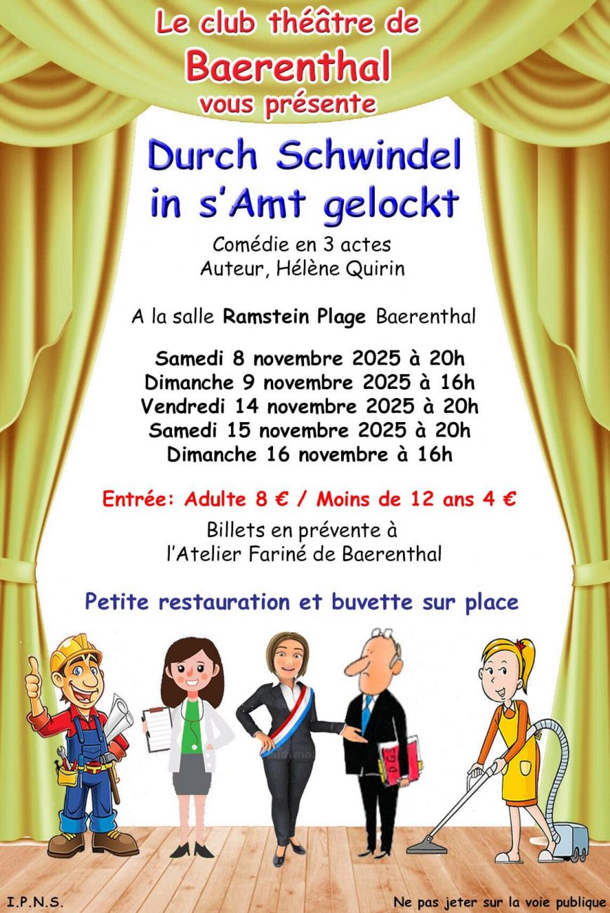 La troupe de Baerenthal présente “Durch Schwindel in s’Amt gelocke” d’Hélène Quirin. La pièce de théâtre sera à découvrir à la salle Ramstein Plage samedi à 21h et dimanche à 16h. L’entrée est à 8 euros.