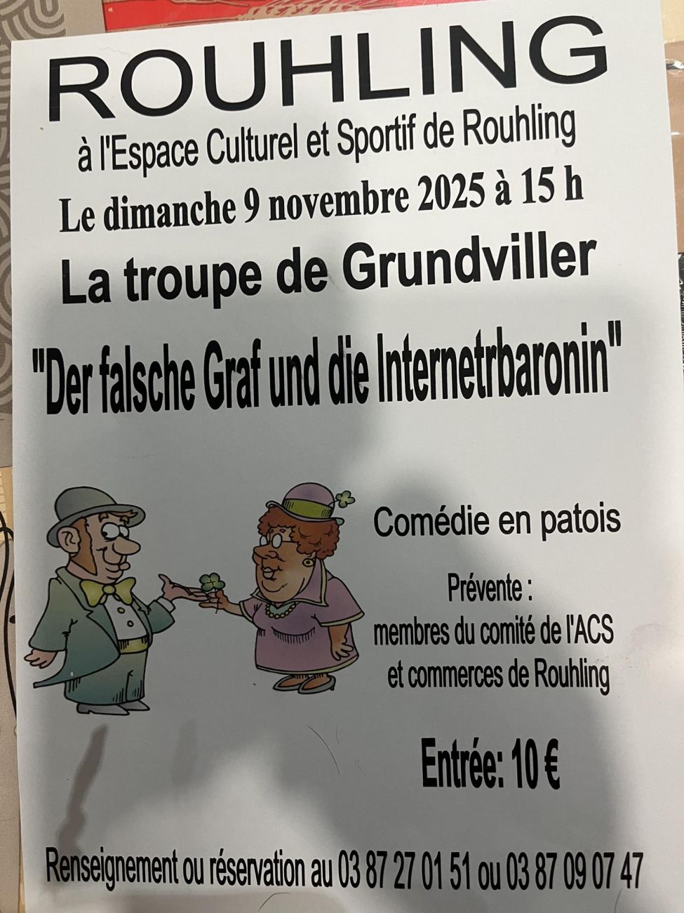 La troupe de Grundviller vous présente sa dernière pièce de théâtre « Der falsche Graf und die Internetbaronin ! » ce dimanche à 15h à l’espace culturel et sportif de Rouhling. Une comédie en patois. Billets en vente au prix de 10€.