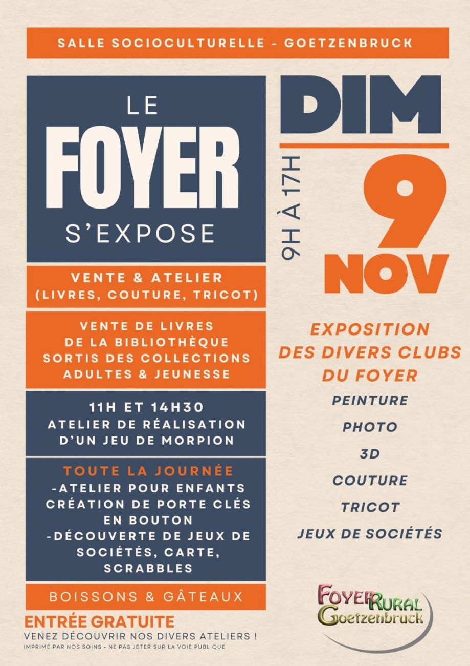Le foyer rural de Goetzenbruck s’expose à la salle socioculturelle dimanche de 9h à 17h avec une vente et des ateliers couture et tricot, il y aura également des livres et une découverte de jeux de société.