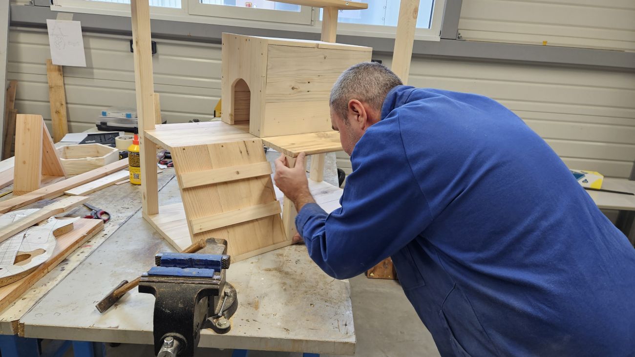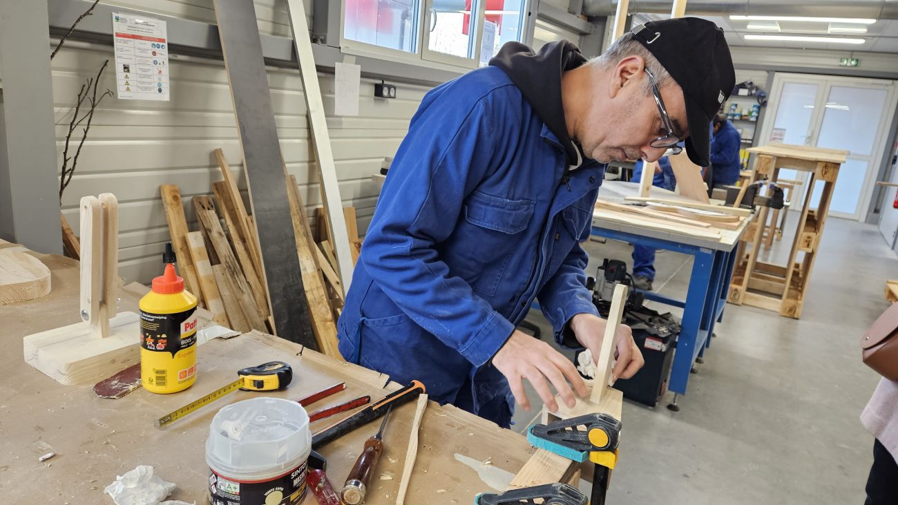 Il nous montre les plans des dizaines d’objets sur lesquels il a déjà travaillé, bac à fleurs, cheval à bascule ou encore mangeoire pour écureuil. Ce matin, il peaufine un abat-jour pour sa dernière création.