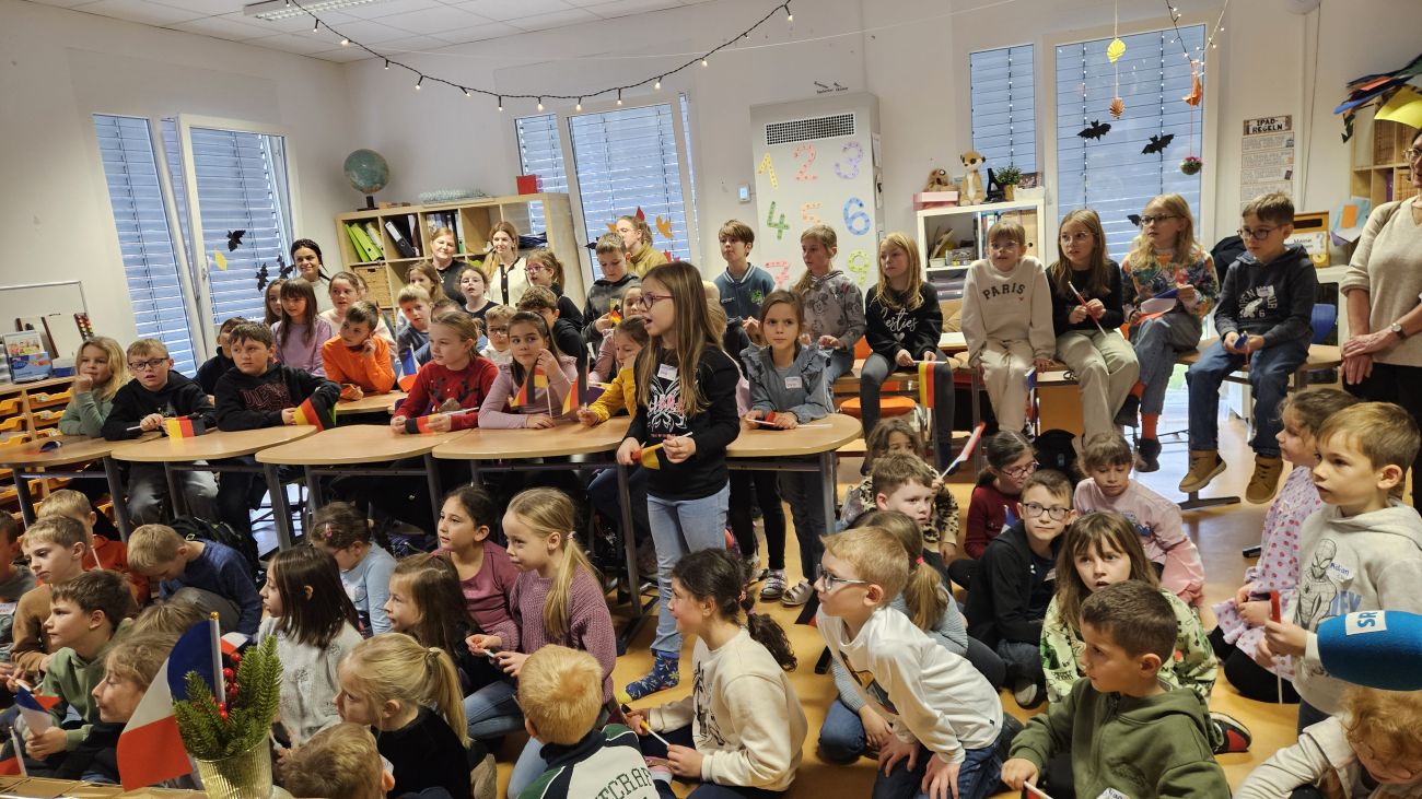 C’est en chanson et avec une haie d’honneur de petits drapeaux français et allemands, que les élèves accueillent le Consul général de France à Sarrebruck, Jérôme Spinoza, venu pour saluer ce nouveau partenariat entre les deux écoles.