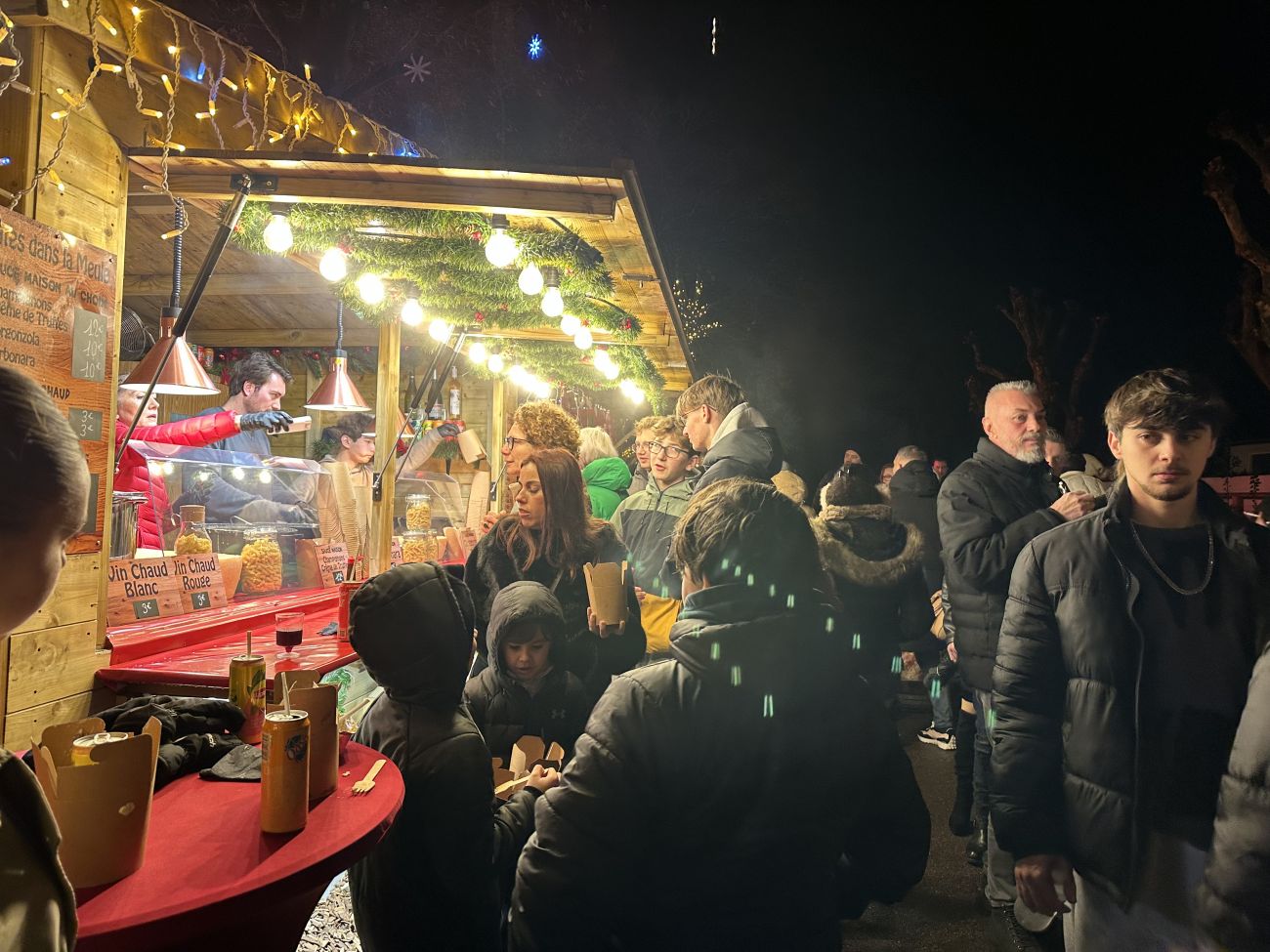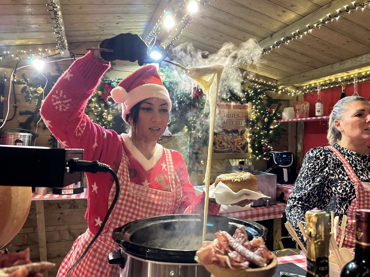 Il y a du jambon fumé, du salami, jambon normal et un camembert frit. Je trouve que ça réconforte, ça amène une convivialité, c’est bien, ça fait un bel esprit de Noël. On rigole, on a un bon petit verre, on a bu un petit chocolat chaud au Baileys, un chocolat chaud au rhum, un bon vin blanc de Noël, c’est top.