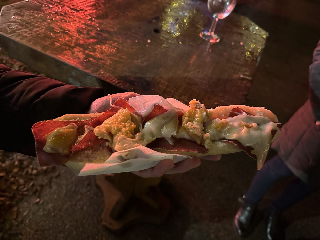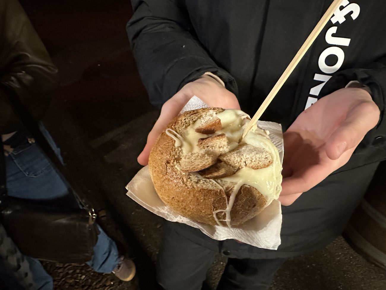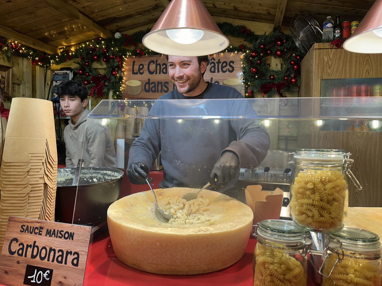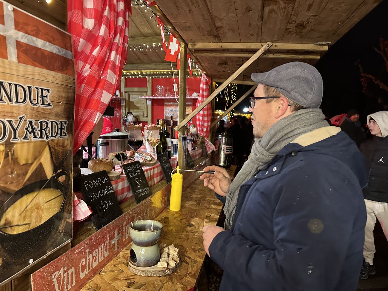 J’étais en train d’apprécier une bonne fondue savoyarde à Forbach. On a le caquelon à l’extérieur avec la bougie en dessous, et les croûtons de pain par-dessus. J’agrémente mon plat avec un vin chaud qui est très agréable. Je suis dans un autre monde.