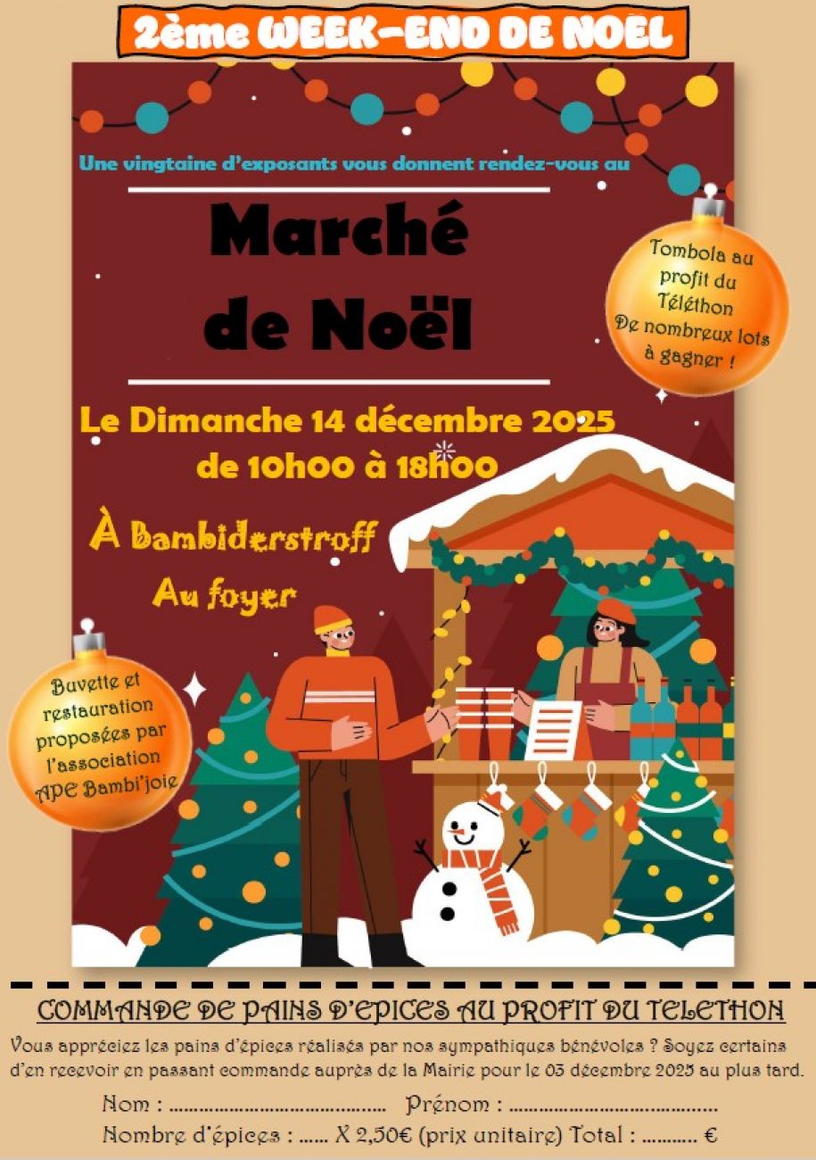 *Marché de Noël de Bambiderstroff dimanche de 10h à 18h avec une vingtaine d'exposants dont un stand photos et une tombola au profit du Téléthon. Rendez-vous au foyer.