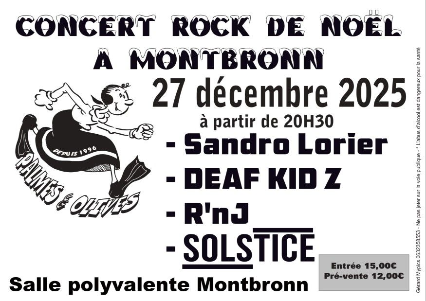 *Concert de rock de Noël à Montbronn ! Samedi 27 décembre, 4 artistes/groupes se produiront à la salle polyvalente dès 20h30. 12€ en prévente, 15€ sur place.