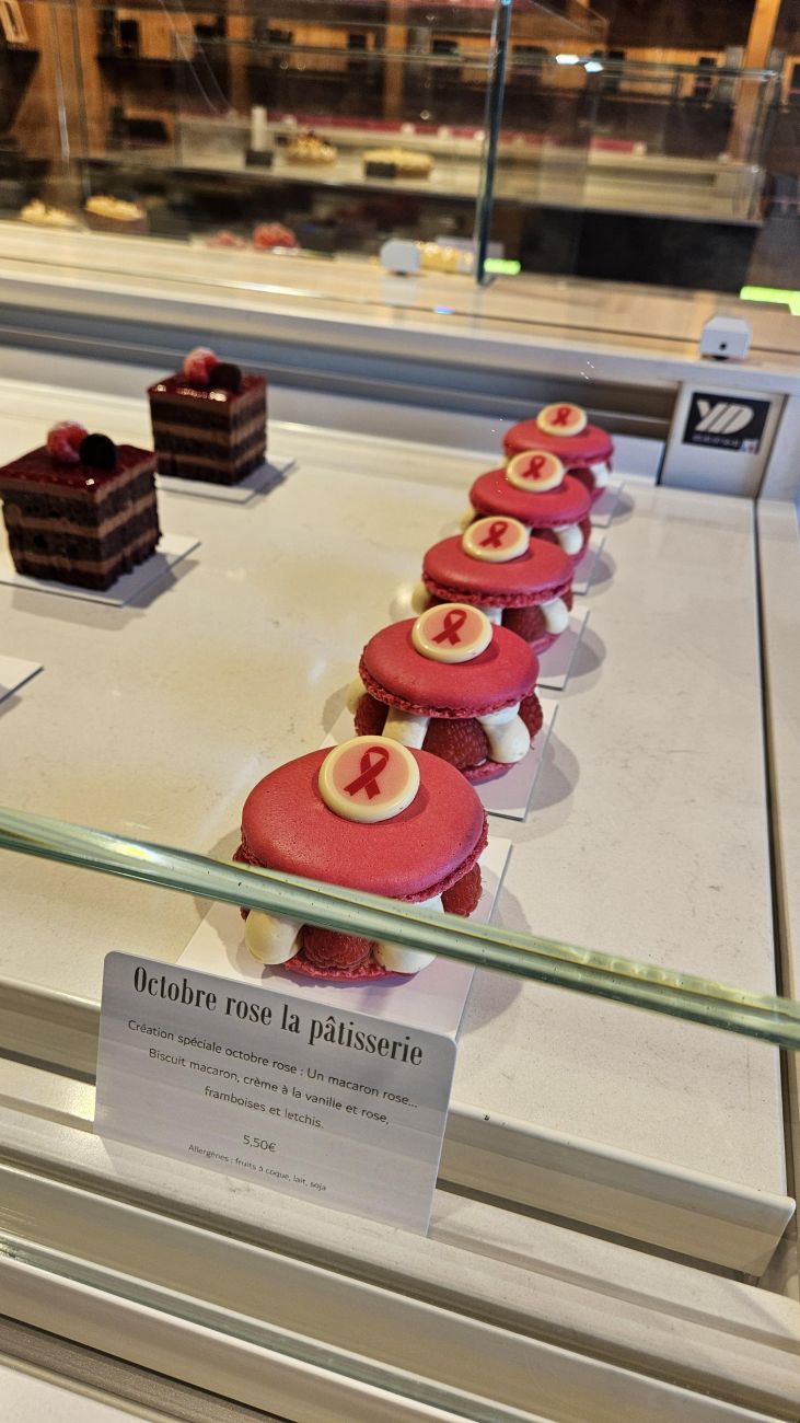 On a fait des petites bouchées praliné maïs en flot donc à l’effigie d’Octobre Rose. On a fait un macaron en forme de cœur à la framboise et à la rose et une pâtisserie toute rose litchi, framboise et rose.