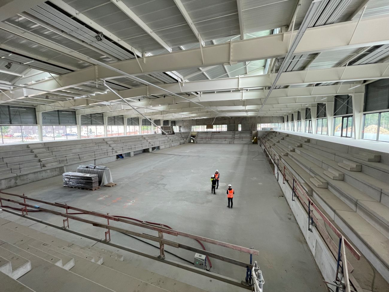 Aujourd'hui, le bâtiment est clos et couvert. Il nous reste les sols sportifs à mettre en place, les sièges qui seront amovibles, terminer aussi le bardage de certaines parties du gymnase B et du gymnase E, et après, il restera encore tout ce qui est sanitaire à mettre en place.