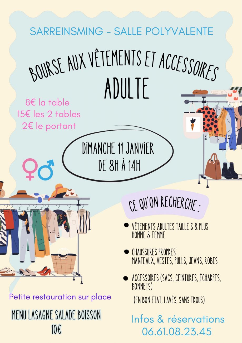Une bourse aux vêtements et accessoires d’adultes a lieu ce dimanche, de 8h à 14h, à la salle polyvalente de Sarreinsming.