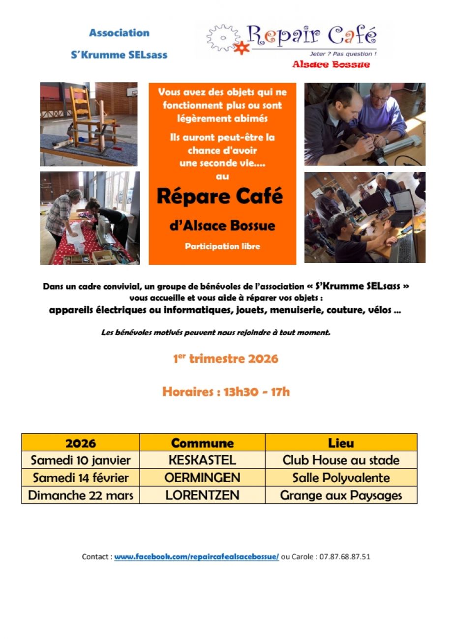 Un repair café est organisé à Keskastel ce samedi de 13h30 à 17h. Vous allez pouvoir déposer vos objets cassés/défectueux au club house du stade.