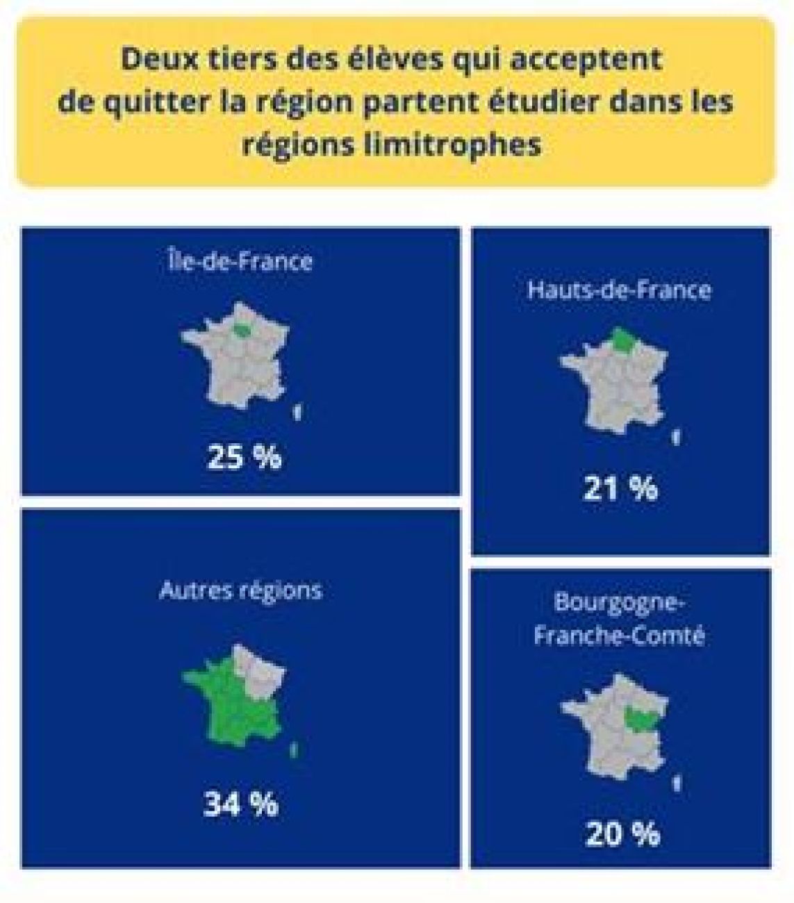 Deux tiers des bacheliers qui acceptent de quitter la région vont dans les régions limitrophes : un quart vers l’Île-de-France, un sur 5 vers les Hauts-de-France et la même proportion vers la Bourgogne-Franche-Comté.