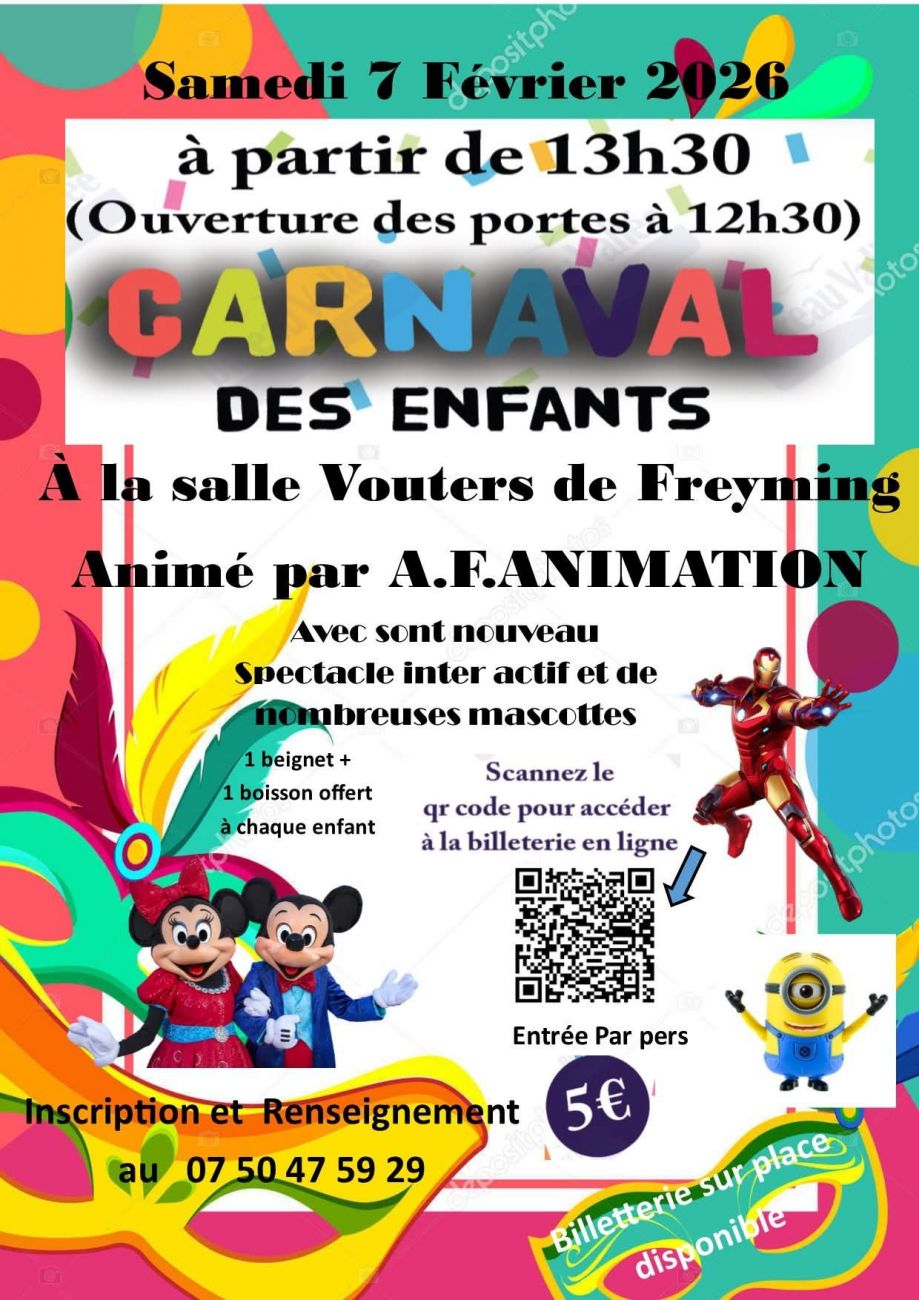 L’association Détenteloisir57 organise un carnaval des enfants ce samedi à la salle Vouters de Freyming. C’est animé par A.F.Animation avec la présence de mascottes. Comptez 5€ l’entrée. Ouverture des portes à 12h30.