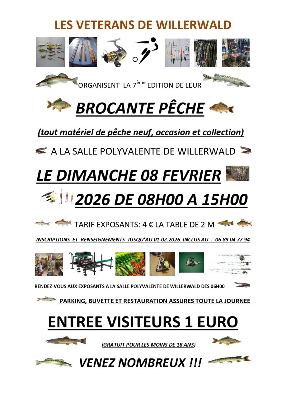 Les vétérans de Willerwald organisent la 7ème édition de leur brocante de pêche ce dimanche de 8h à 15h. Vous pourrez retrouver du matériel neuf, d’occasion et de collection. Comptez 1€ l’entrée.