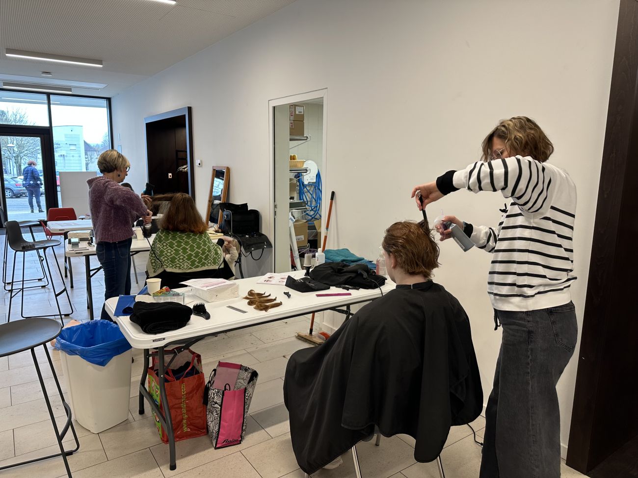 Deux coiffeuses bénévoles s’occupent de couper un minimum de 10 centimètres de longueur de cheveux sur les particuliers comme Catherine, venus pour la bonne cause.