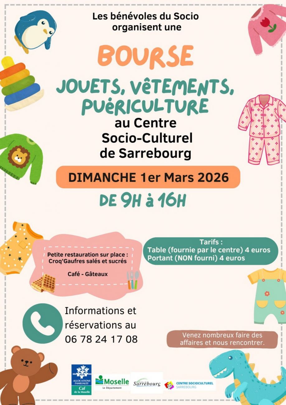 Une bourse aux jouets et vêtements de puériculture a lieu ce dimanche, entre 9h et 16h au centre socioculturel de Sarrebourg. Entrée libre.