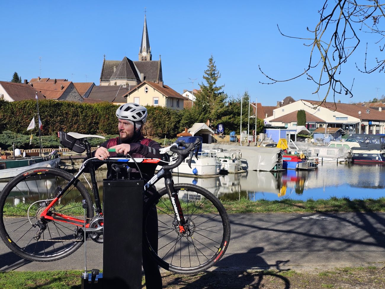 La borne est déjà prête à accueillir les premiers cyclistes. Pierre Hertzog-Zins, membre du conseil municipal de Wittring nous fait une démonstration avec son vélo. C’est lui qui est à l’origine du projet.