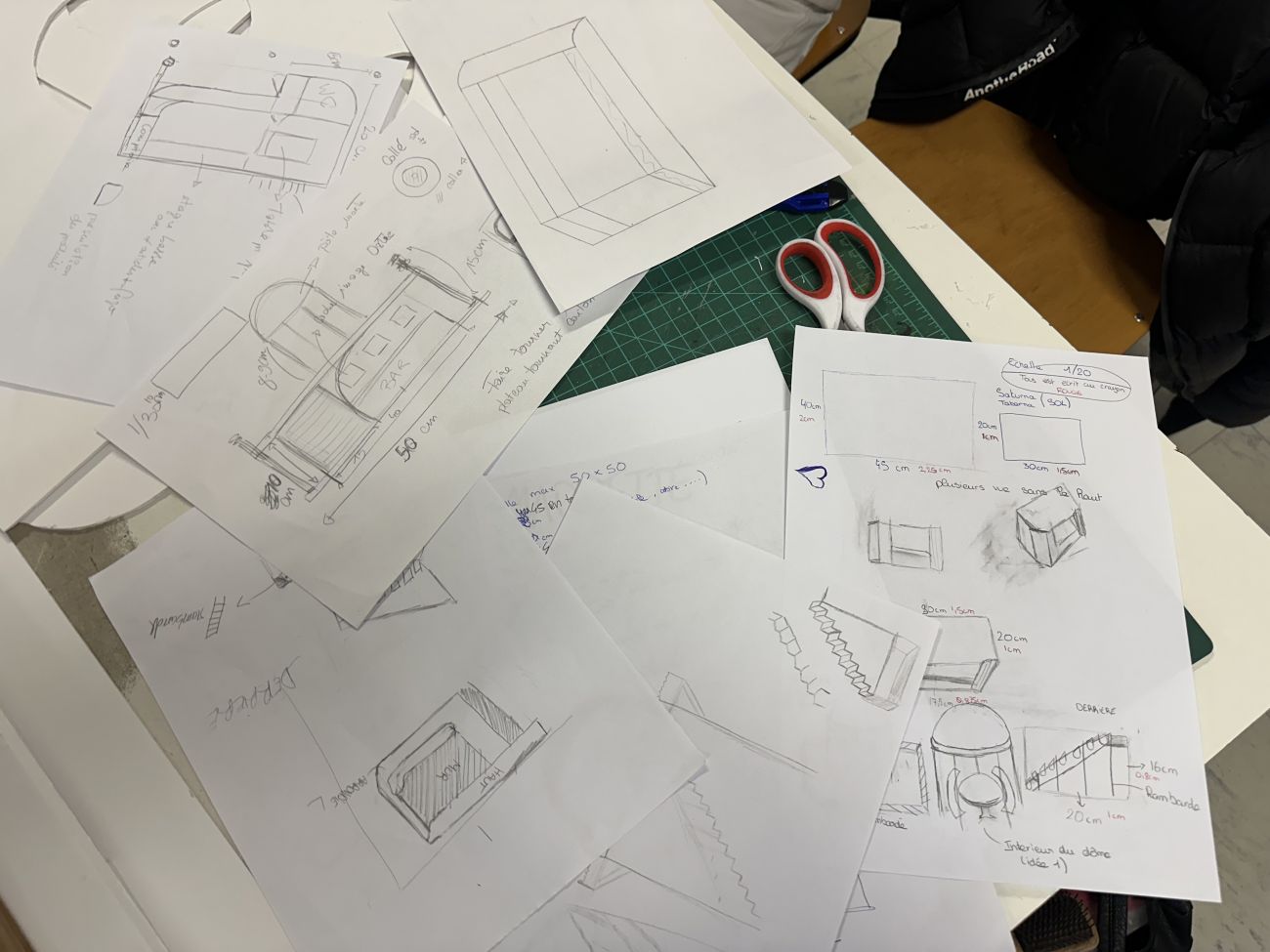 Ici, on aura tout le côté vente, qui sera ouvert sur la rue. Pour le dôme, qui sera sur la partie supérieure, on utilise de la pâte morte. Ce sont les personnes au TP qui sont en train de faire des tests et qui voient comment on pourra faire rentrer ça.
