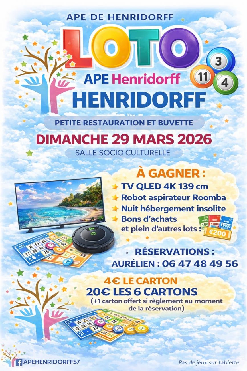 Un loto est également organisé par l’APE Henridorff ce dimanche à la salle socioculturelle dès 14h. Parmi les lots une télé 4K, un robot aspirateur ou encore une nuit dans un hébergement insolite.