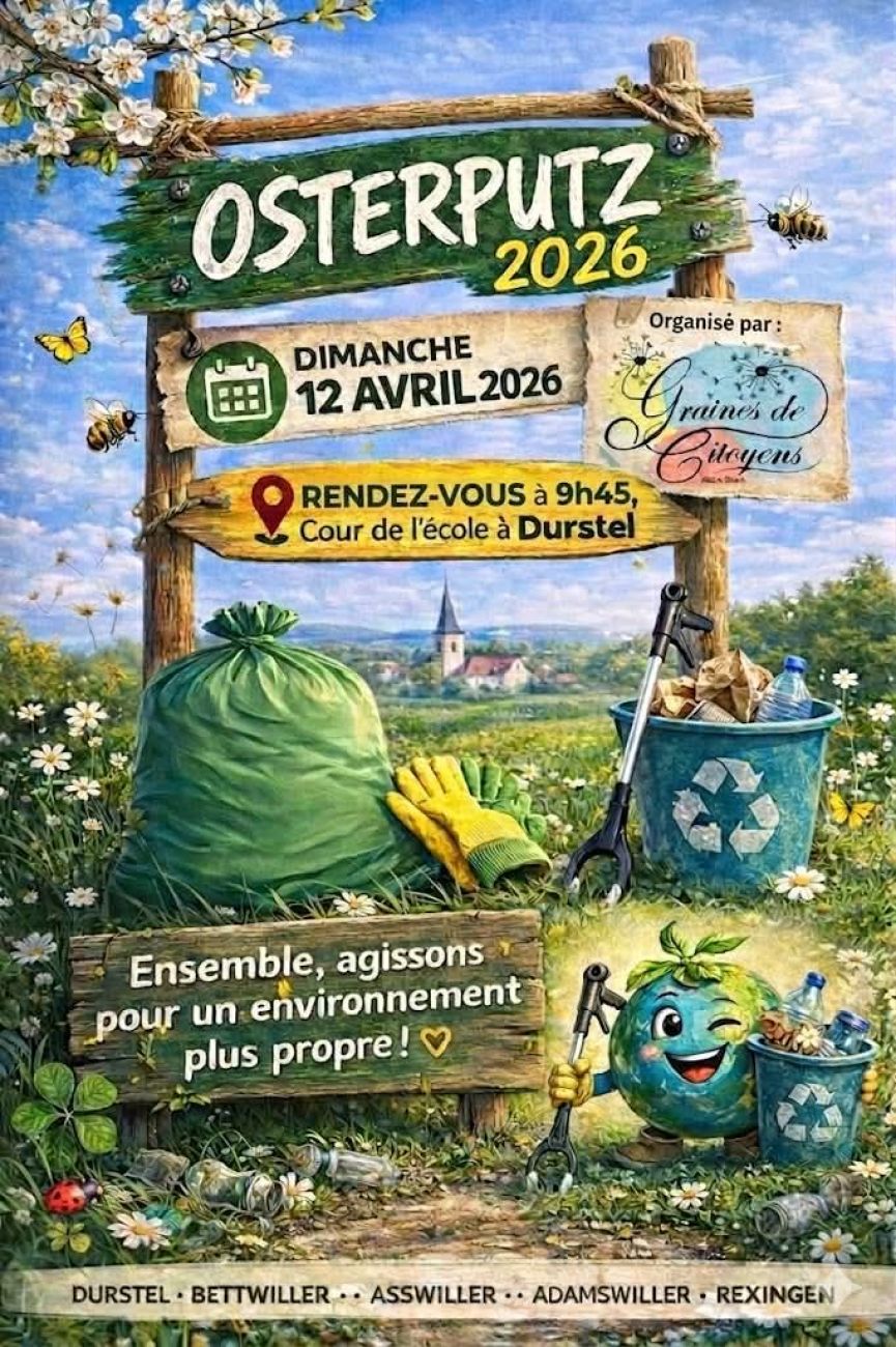 Ce dimanche, il est possible de rendre la commune de Durstel plus belle. L'association Graines de citoyens propose un nettoyage de printemps, Osterputz, le 12 avril. Rendez-vous à 9h45 dans la cour de l'école de Durstel.