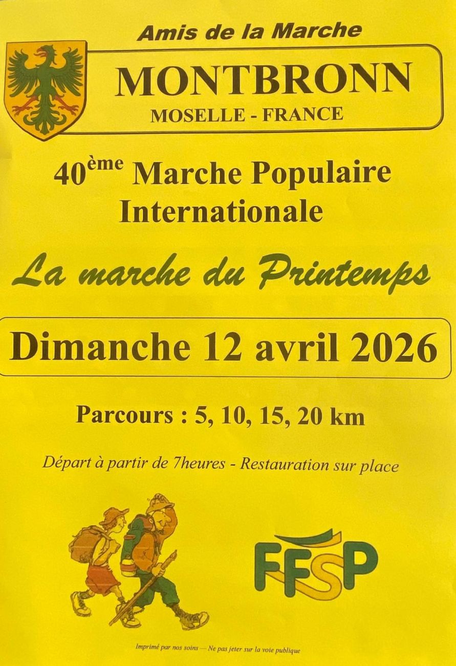 40ème marche populaire de Montbronn. Les Amis de la Marche vous donne rendez-vous dès 7h à la salle polyvalente pour des parcours de 5, 10, 15 et 20 km. Plein tarif : 3€. Restauration sur place.
