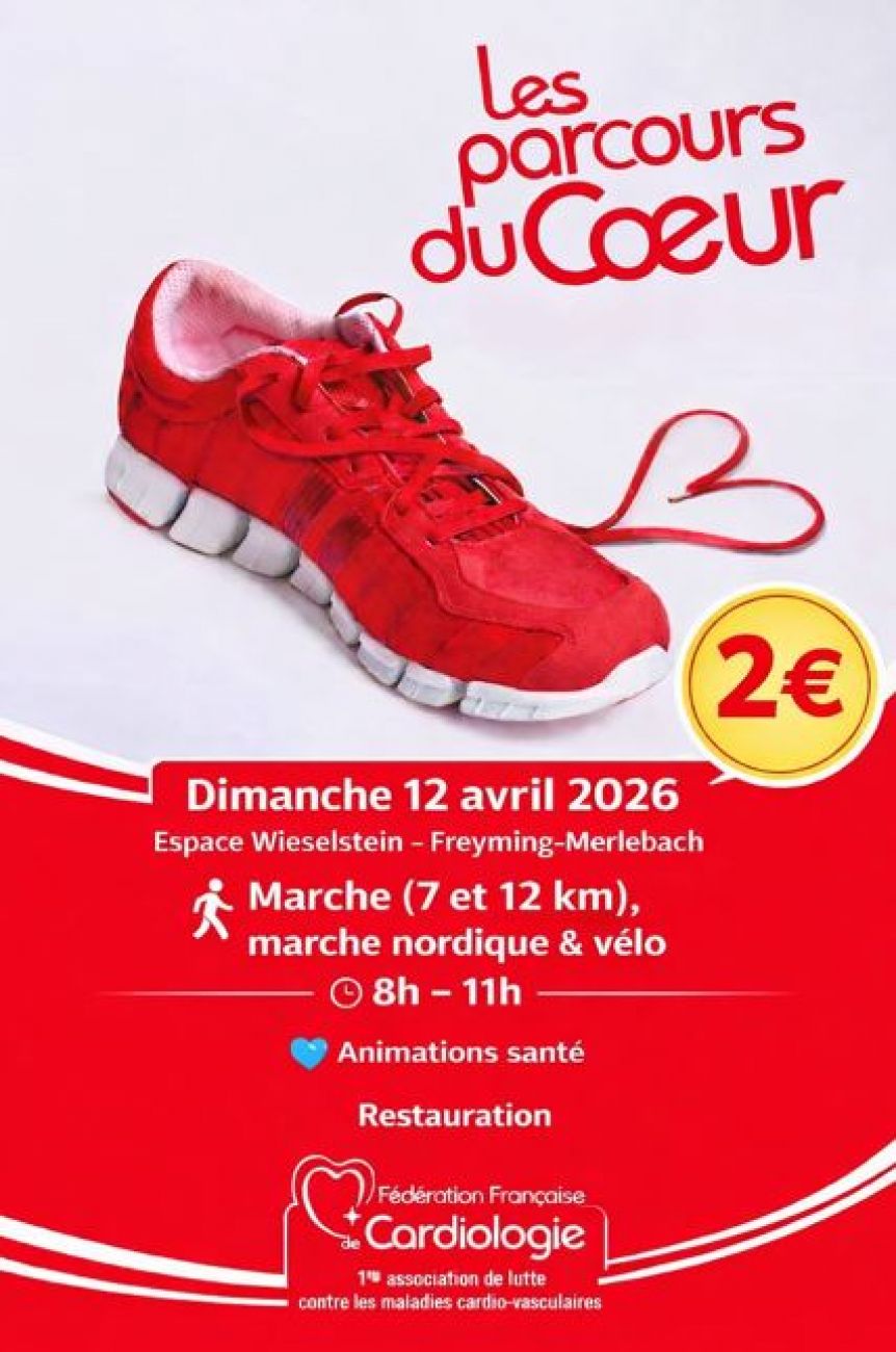 Les Parcours du cœur 2026 à Freyming-Merlebach. Marche, marche nordique, vélo, animations santé et restauration sur place… une journée conviviale pour prendre soin de votre cœur. Rendez-vous entre 8h et 11h dimanche à l’espace Wiselstein de Freyming-Merlebach. Participation : seulement 2 euros (reversés en don à la Fédération Française de Cardiologie).