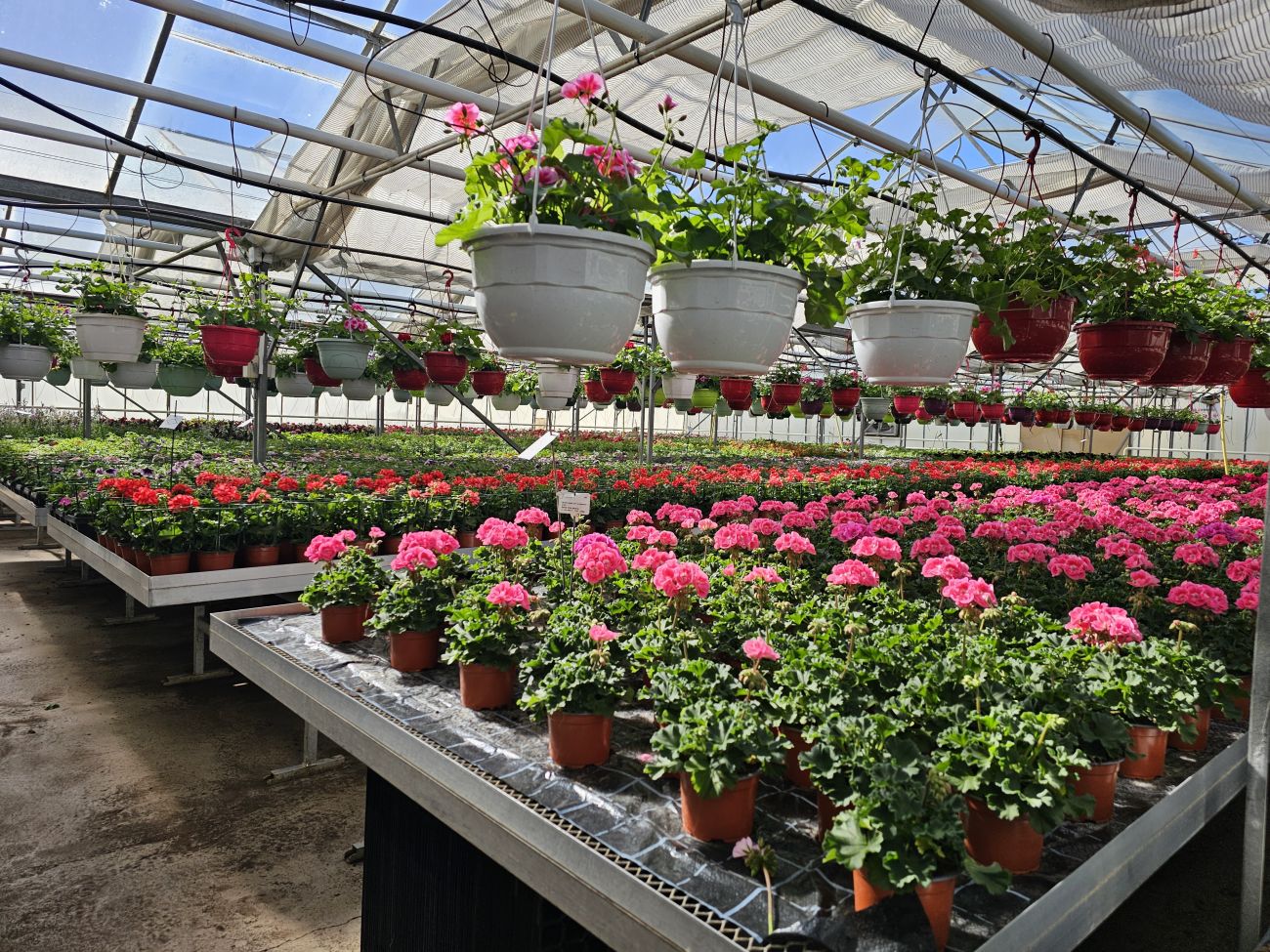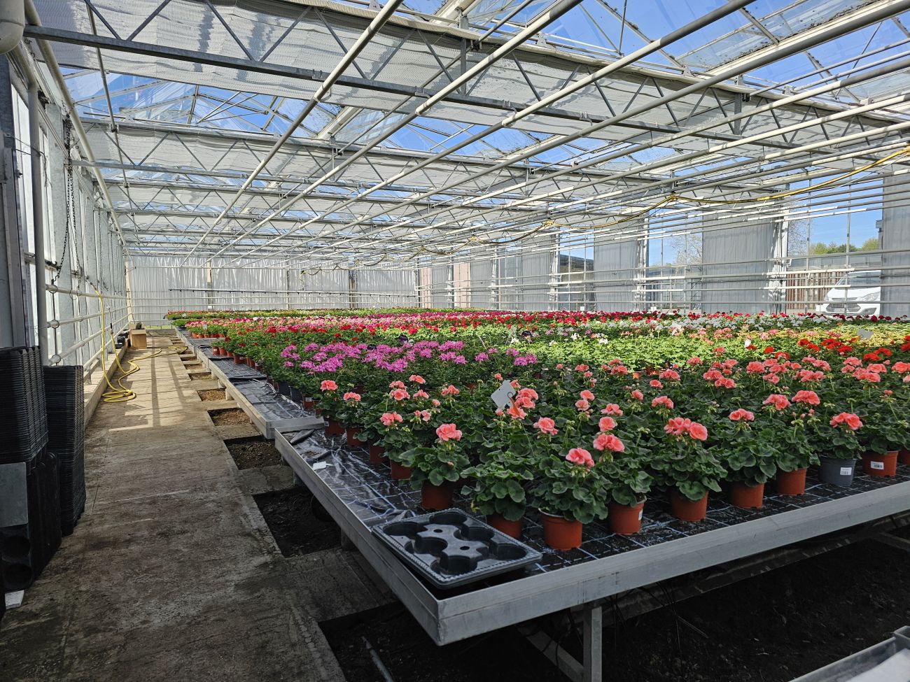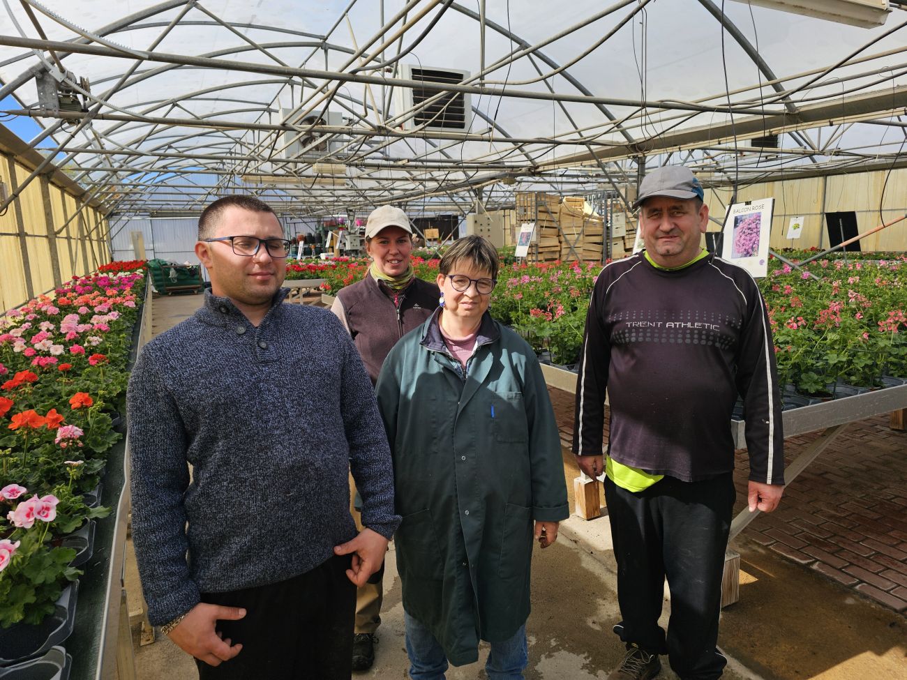 Vous voyez, ici, c’est la serre géraniums : les « balcon », les « zonal », les « Calliope ».
