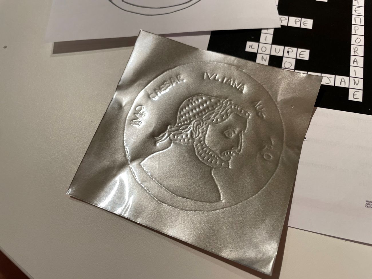 Pour l’activité, le médaillon est réalisé avec un modèle et une feuille de métal repoussé. Si l’exercice n’est pas compliqué en soit, ce sont les significations dessus qui sont intéressantes. On y retrouve la tête de l’empereur et sa titulature.