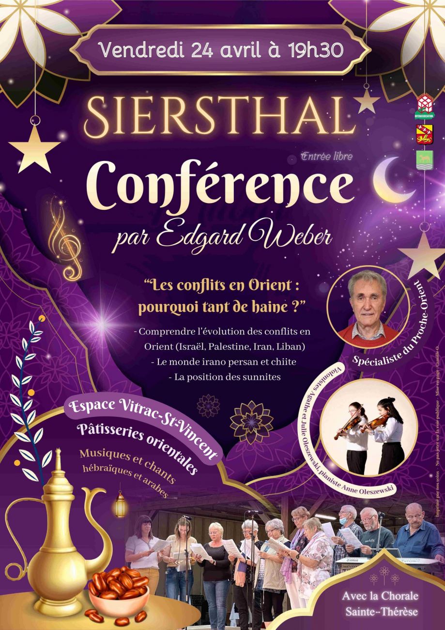 Une conférence sur les conflits en Orient se tiendra à 19h30 à l’Espace Vitrac-Saint-Vincent de Siersthal. Le tout sera accompagné de chants et musiques arabes et israélites ainsi que par une dégustation de pâtisseries orientales. L’entrée est libre.