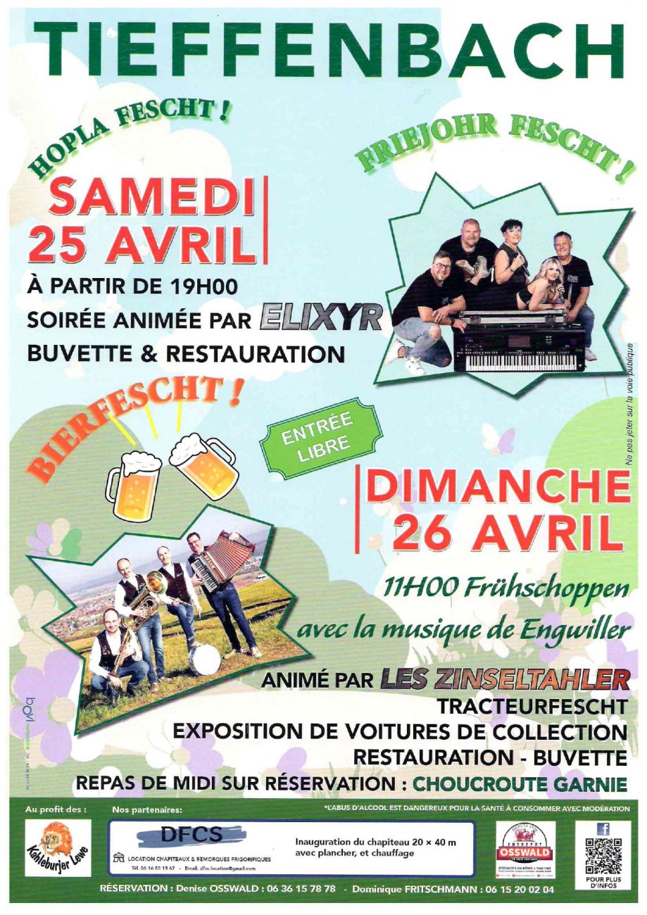 Week-end festif à Tieffenbach, la soirée du samedi est animée dès 19h par ELIXYR. Buvette et restauration sont prévues sur place. Rendez-vous ensuite à 11h le dimanche. Au programme fête de tracteurs, exposition de voitures de collection et choucroute garnie le midi.