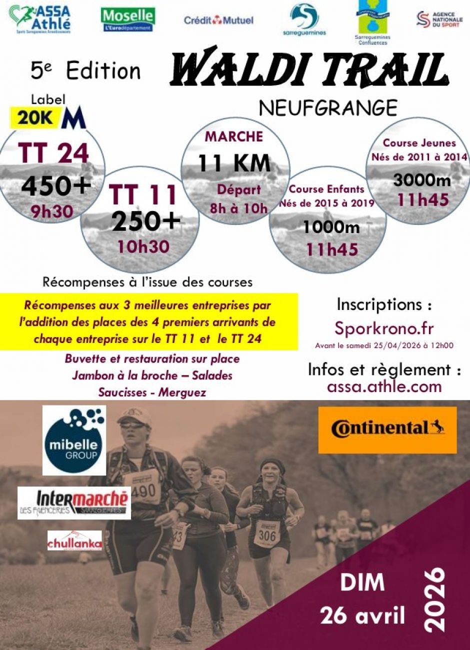 5ème édition du Waldi Trail ce dimanche à Neufgrange. Entre 8h et 11h45 plusieurs marches et courses sont organisées. Les inscriptions sont ouvertes sur Sporkrono. Le prix des inscriptions varie selon les différents parcours.