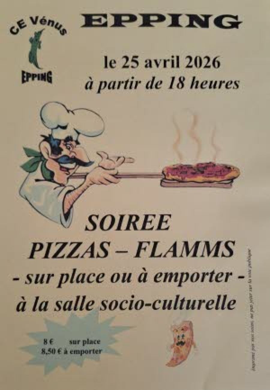 Soirée pizzas-flamms ce samedi à partir de 18h dans la salle socio-culturelle d’Epping. Les pizzas sont au prix de 8 euros sur place et de 8,50 euros à emporter.