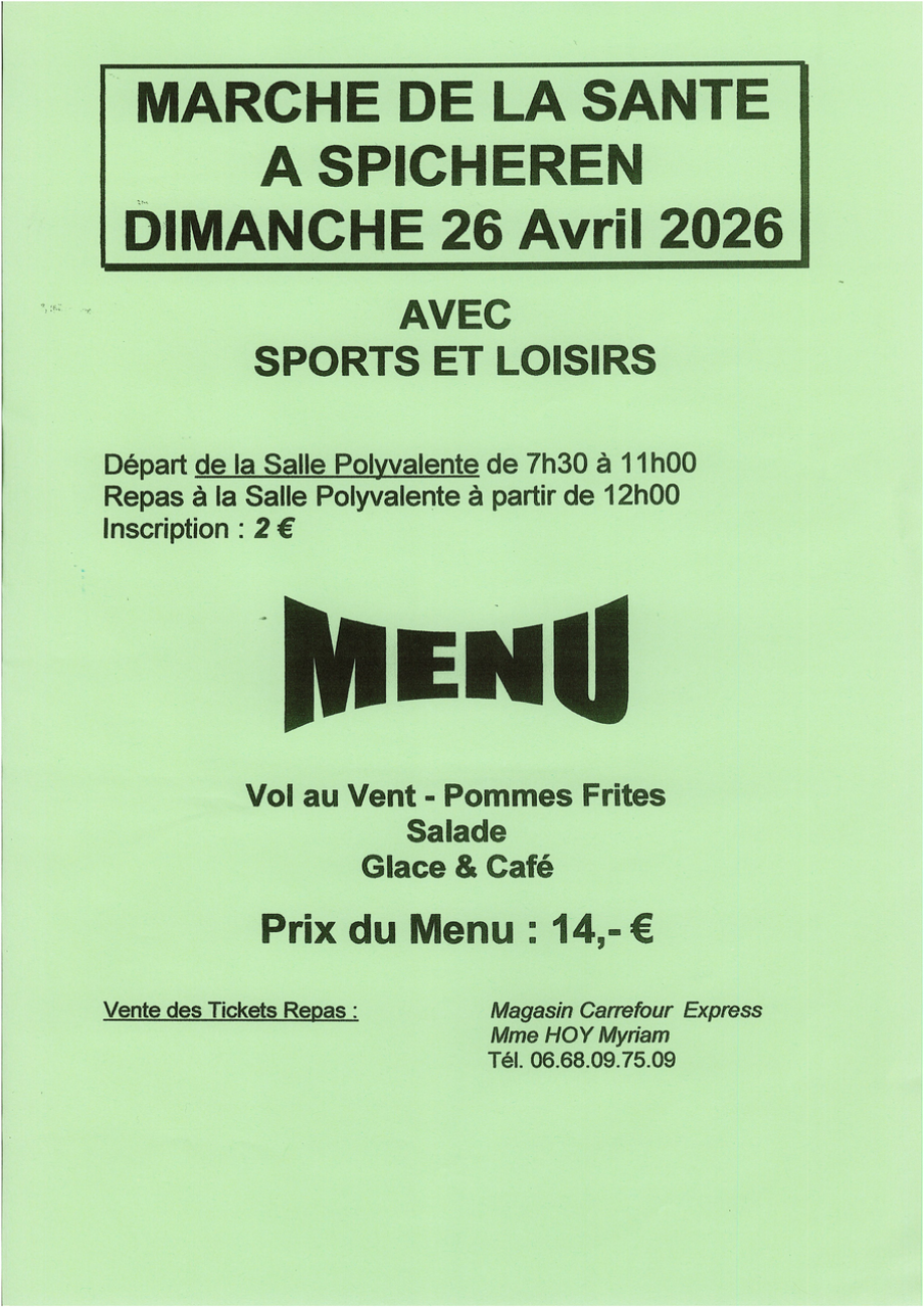 Une marche de la santé est organisée ce dimanche à Spicheren de 7h30 à 11h. Rendez-vous à la salle polyvalente pour le départ de 2 circuits de 7km et 13km. Les inscriptions sont au prix de 2 euros et sont ouvertes en ligne et au Carrefour Market jusqu’au 26 avril inclus. Le repas sur réservation est à 14 euros.