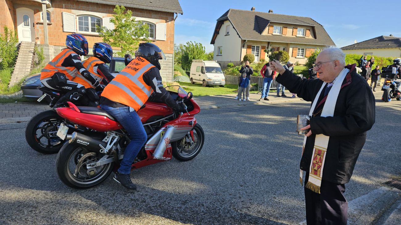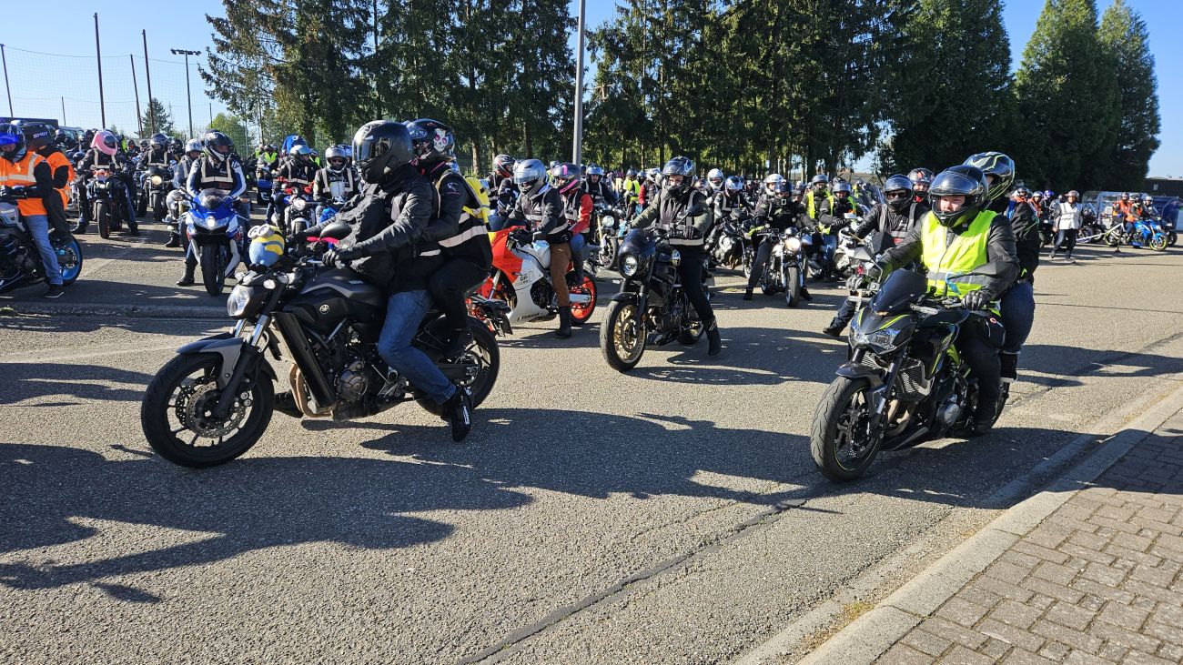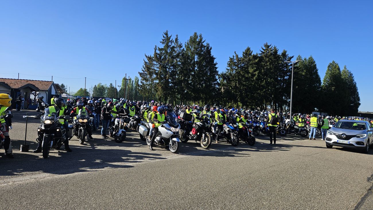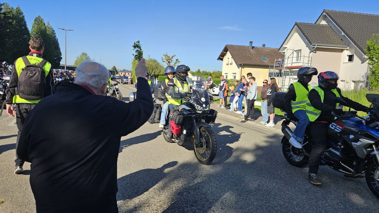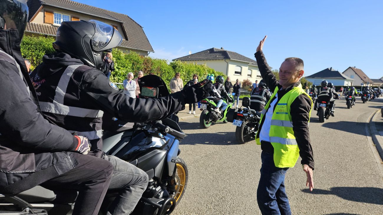 9h, c’est parti, Jacques Lang, le président d’Une rose un espoir secteur Bitcherland donne le départ aux 317 motos.