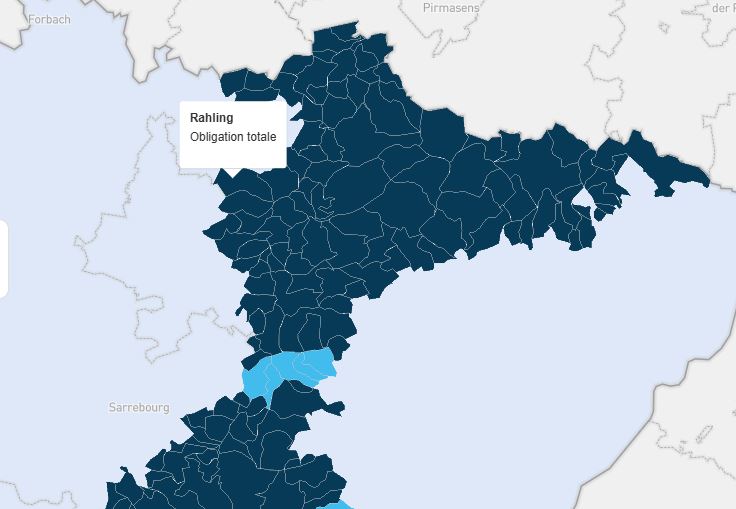 Une partie de la Moselle-Sud, du pays de Bitche et de l’Alsace-Bossue est concernée. On peut citer : Obergailbach, Soucht, Volmunster, Diemeringen, Butten, Saverne, Abreschviller ou encore Dabo. L’A4 est exclue du périmètre.