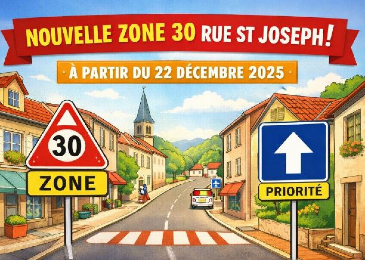 À partir de ce lundi 22 décembre, la rue Saint Joseph passe en ZONE 30 sur la portion allant du plateau surélevé jusqu’au virage après le n°1.